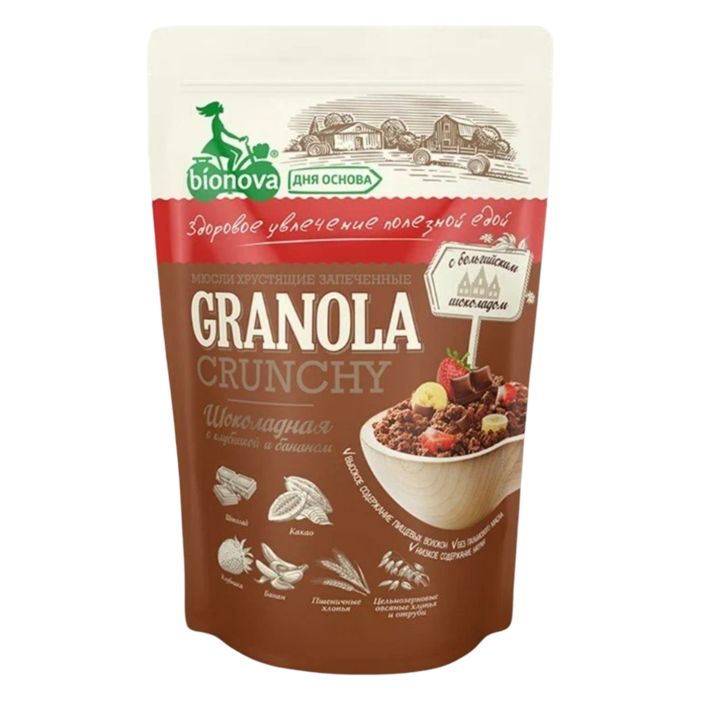 Мюсли BIONOVA хрустящие запеченные шоколадные с клубникой и бананом 400г